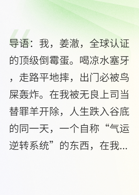《全球最倒霉的我,绑定了气运逆转系统》是一本现代,爽文,逆袭小说,主角分别是【气运值姜澈李莉】,由网络作家“想你的夜o”所著,故事情节引人入胜。本站纯净无广告,欢迎阅读!本书共计18439字,12章节,更新日期为2025-11-14。该作品目前在本网 【fengtlc.com】上完结。小说详情介绍:全球最倒霉的我,绑定了气运逆转系统