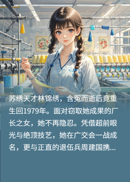 主角【林锦绣白丽娜】在年代,年代小说《重生七九,锦绣苏绣女王叱咤风云》中演绎了一段精彩的故事,由实力作家“爱吃海盐烤虾的古嬷嬷”创作,本站无广告干扰,欢迎阅读!本书共计10529字,1章节,更新日期为2025-11-14。该作品目前在本网 【fengtlc.com】上完结。小说详情介绍:重生七九,锦绣苏绣女王叱咤风云