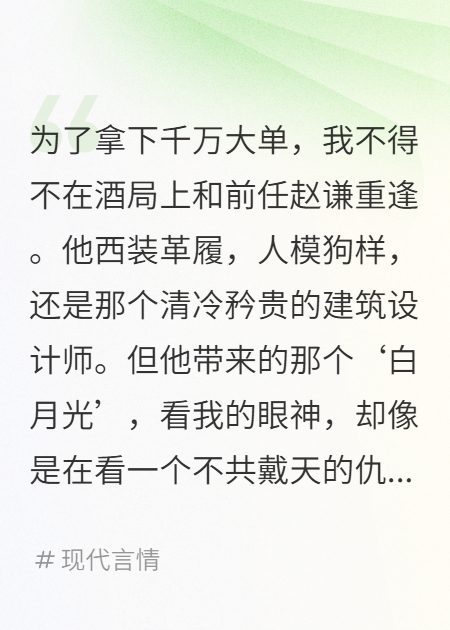 专为书荒朋友们带来的《我那建筑师前任的白月光穿着瑜伽裤堵我》主要是描写赵谦张总林茵之间一系列的故事,作者俺就是土狗细致的描写让读者沉浸在小说人物的喜怒哀乐中。我那建筑师前任的白月光穿着瑜伽裤堵我